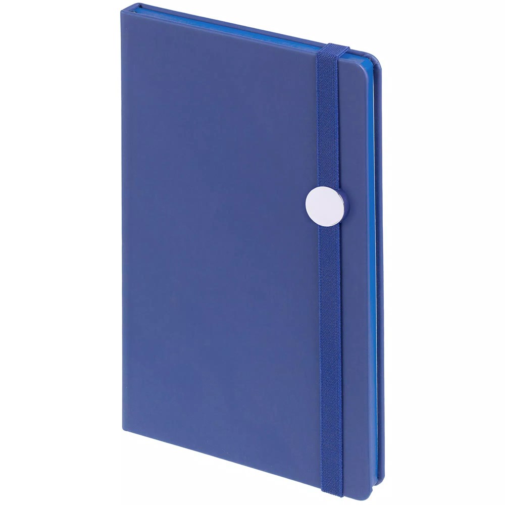 Блокнот в твердой обложке, выполнен из материала Soft Touch Pearl, синий НН, дополнен резинкой и ляссе в цвет обложки.