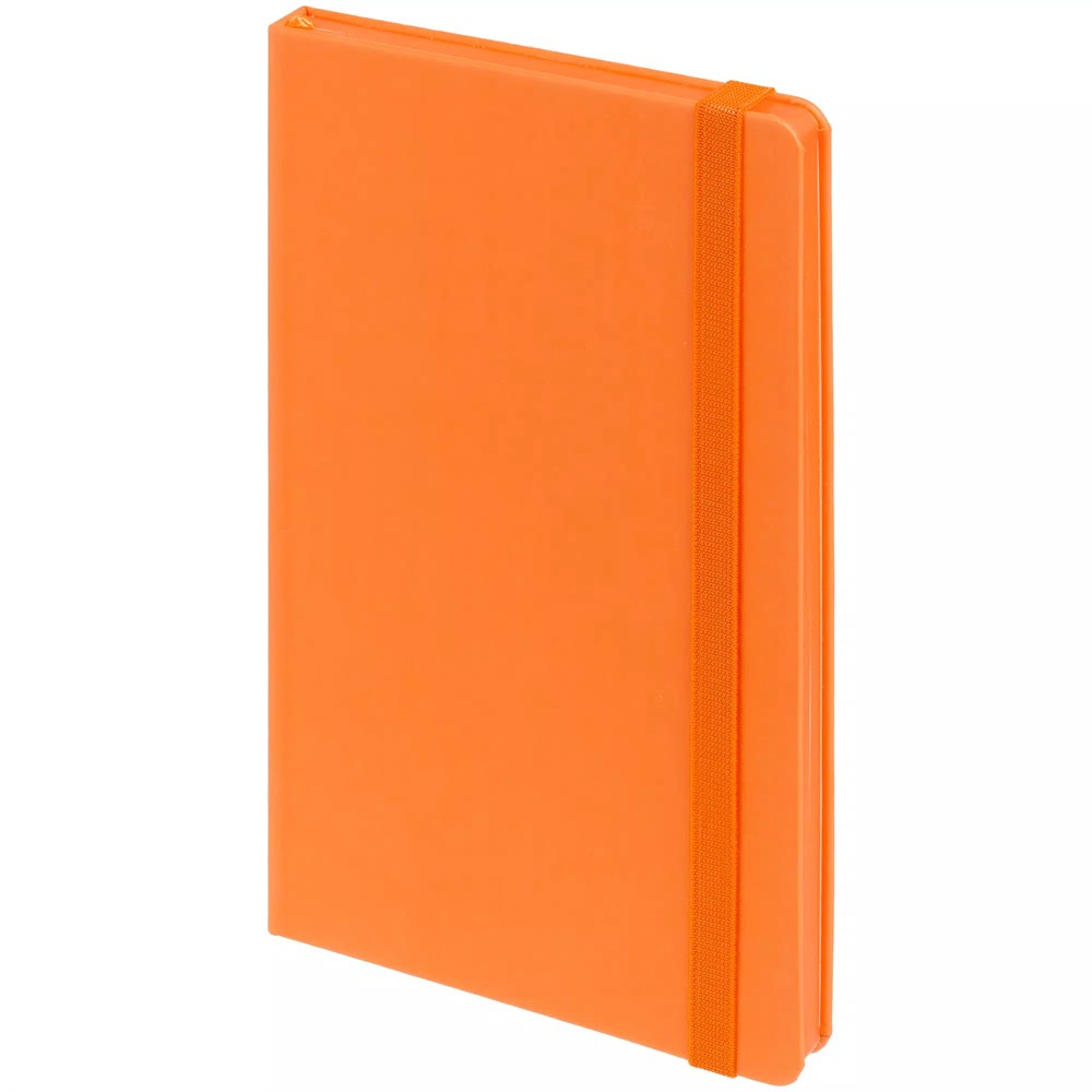 Блокнот в твердой обложке, выполнен из материала Soft Touch, оранжевый ОО, дополнен резинкой и ляссе в цвет обложки.