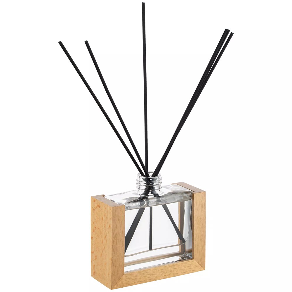 Изящный стеклянный флакон в обрамлении натурального дерева станет стильным элементом декора.