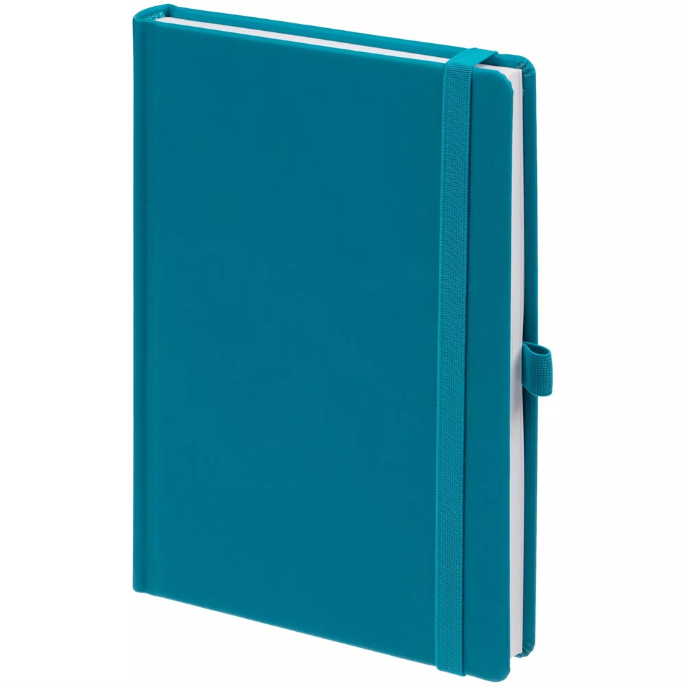 Ежедневник с твердой обложкой без поролона, выполнен из материала Soft Touch, цвет морской волны II, дополнен резинкой шириной 1 см, петлей-резинкой для ручки, капталом и ляссе темно-бирюзового цвета.
