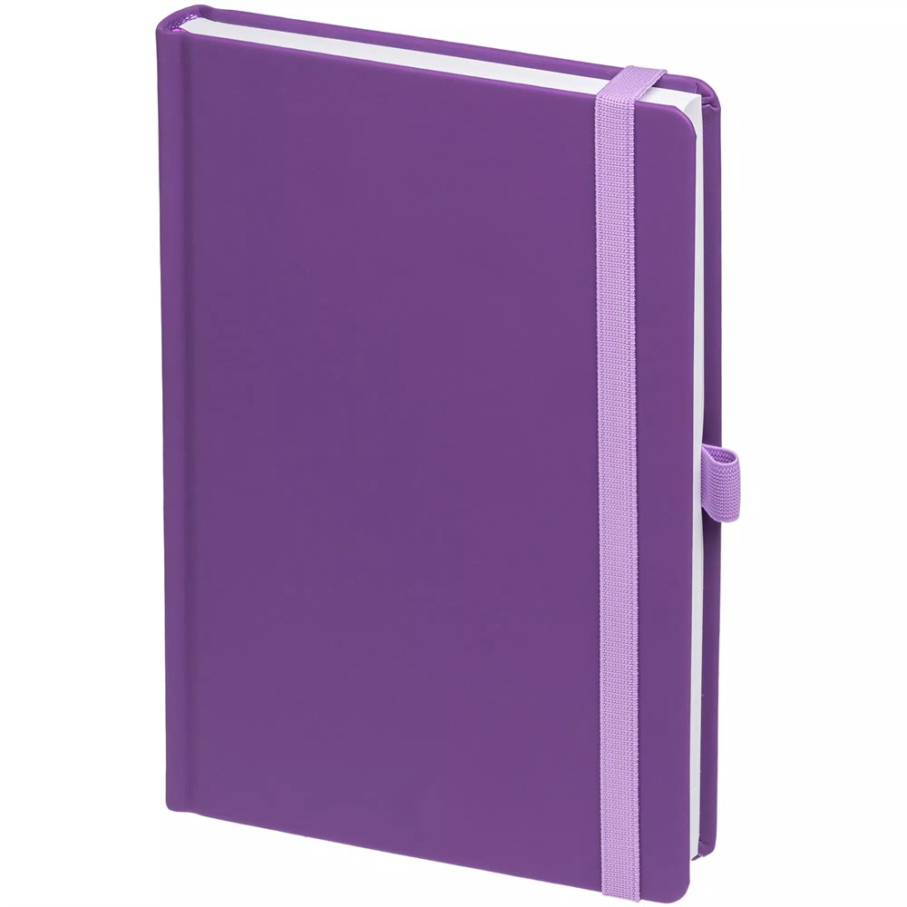 Ежедневник с твердой обложкой без поролона, выполнен из материала Soft Touch, фиолетовый UU, дополнен резинкой шириной 1 см, петлей-резинкой для ручки, капталом и ляссе в цвет обложки.