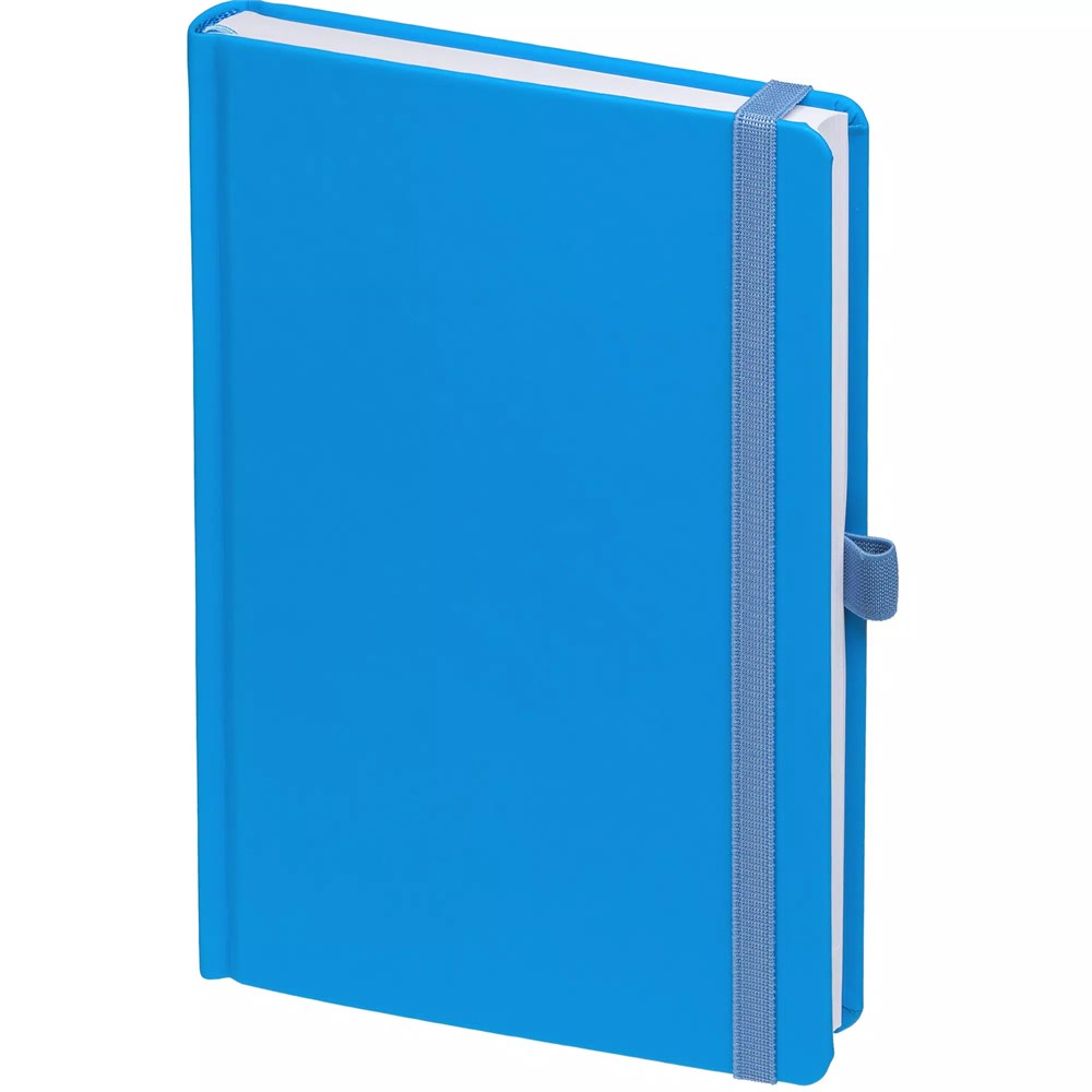 Ежедневник с твердой обложкой без поролона, выполнен из материала Soft Touch Ultra, голубой JJ, дополнен резинкой шириной 1 см, петлей-резинкой для ручки, капталом и ляссе голубого цвета.