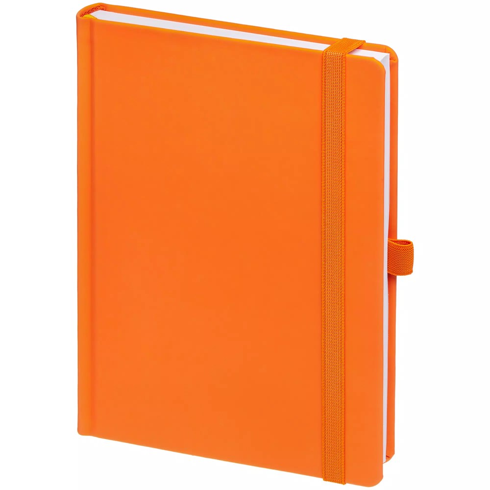 Ежедневник с твердой обложкой без поролона, выполнен из материала Soft Touch, оранжевый ОО, дополнен резинкой шириной 1 см, петлей-резинкой для ручки, капталом и ляссе оранжевого цвета.