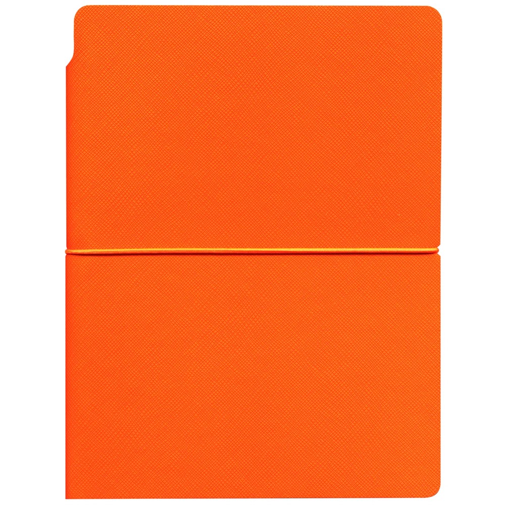 Ежедневник с гибкой обложкой выполнена из материала Nice Touch, оранжевый и Latte, оранжевый (внутренняя часть обложки), дополнен горизонтальной резинкой в цвет обложки. Внутри корешка — специальное место для крепления ручки размером до 15х1 см.