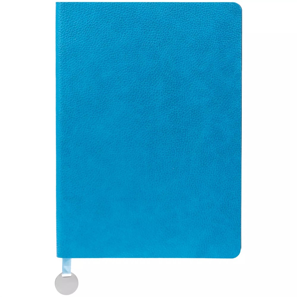 Ежедневник с гибкой обложкой, выполнен из материал La Fite, голубой JJ, дополнен ляссе в цвет обложки с металлическим шильдом.