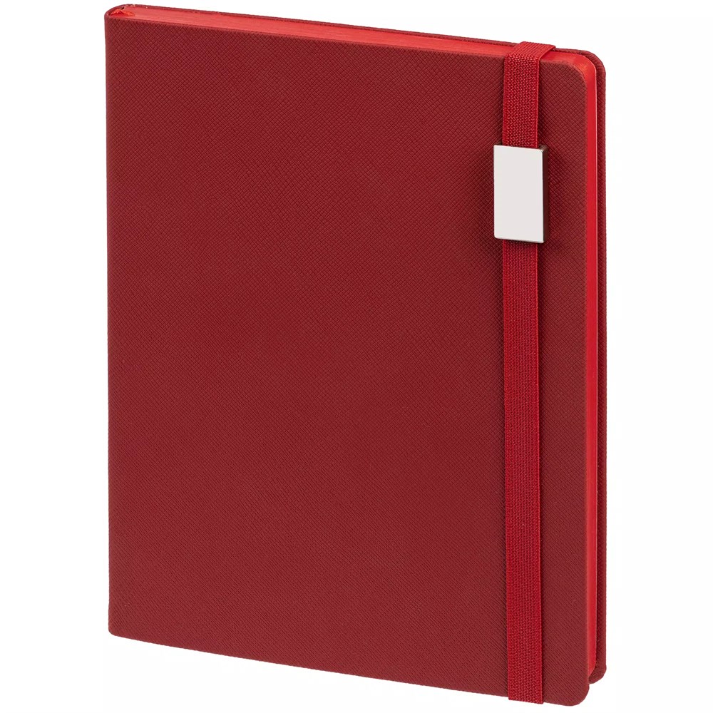 Ежедневник с полутвердойобложкой выполнен из материала Nice Touch, красный PP, и дополнен резинкой шириной 1 см с металлическим шильдом и ляссе красного цвета.