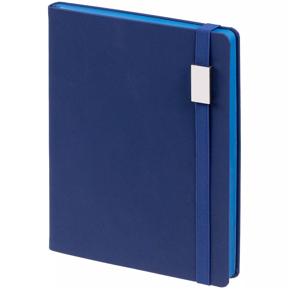 Ежедневник с полутвердой обложкой выполнен из материала Nice Touch, синий НН, и дополнен резинкой шириной 1 см с металлическим шильдом и ляссе синего цвета.