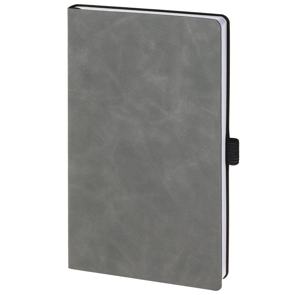 Ежедневник с гибкой обложкой, выполнен из материала Nubuck Touch, темно-серый EE, дополнен ляссе и петлей-резинкой для ручки черного цвета.