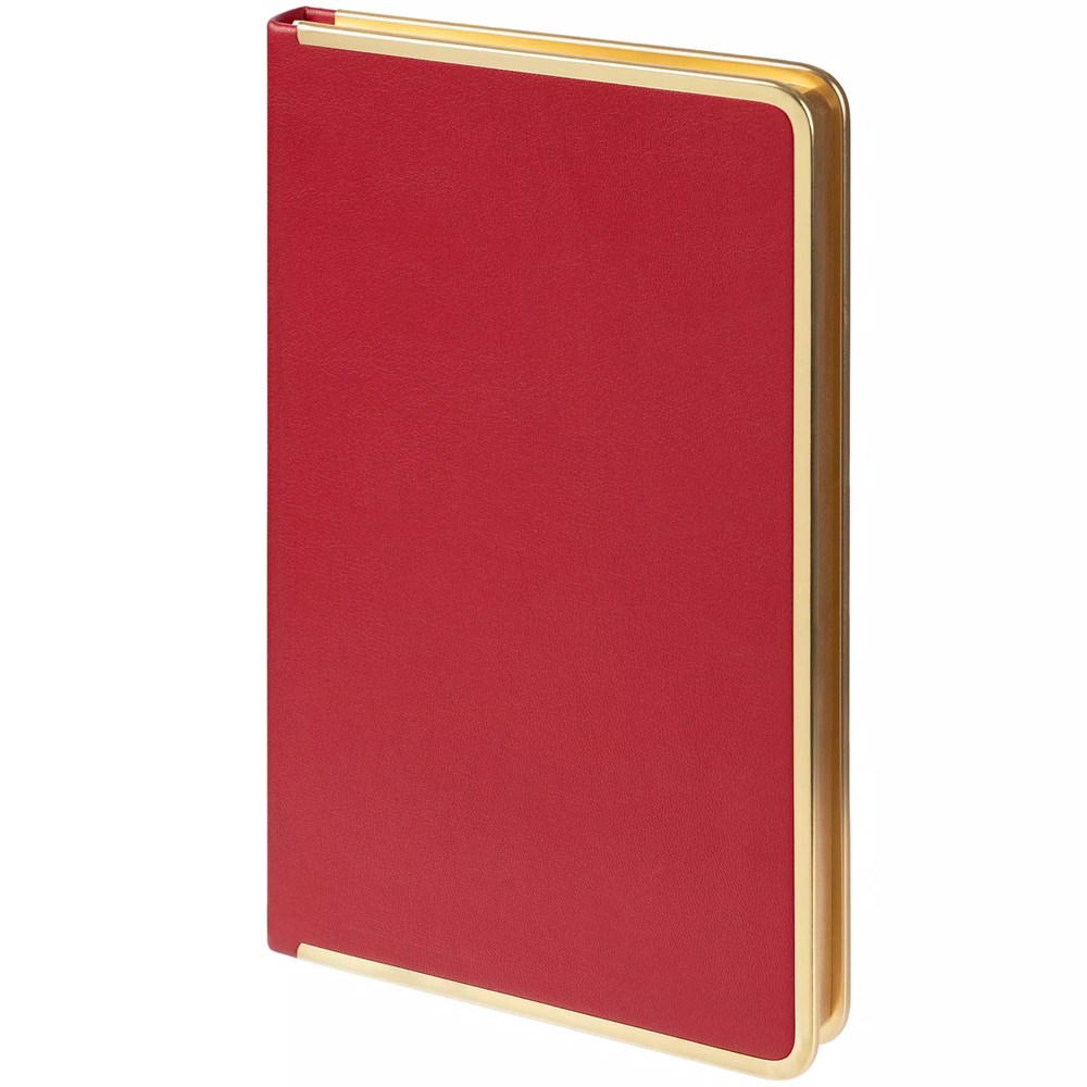 Изящный ежедневник с зауженным блоком и стильными деталями — металлической окантовкой на обложке и металлизированным обрезом.