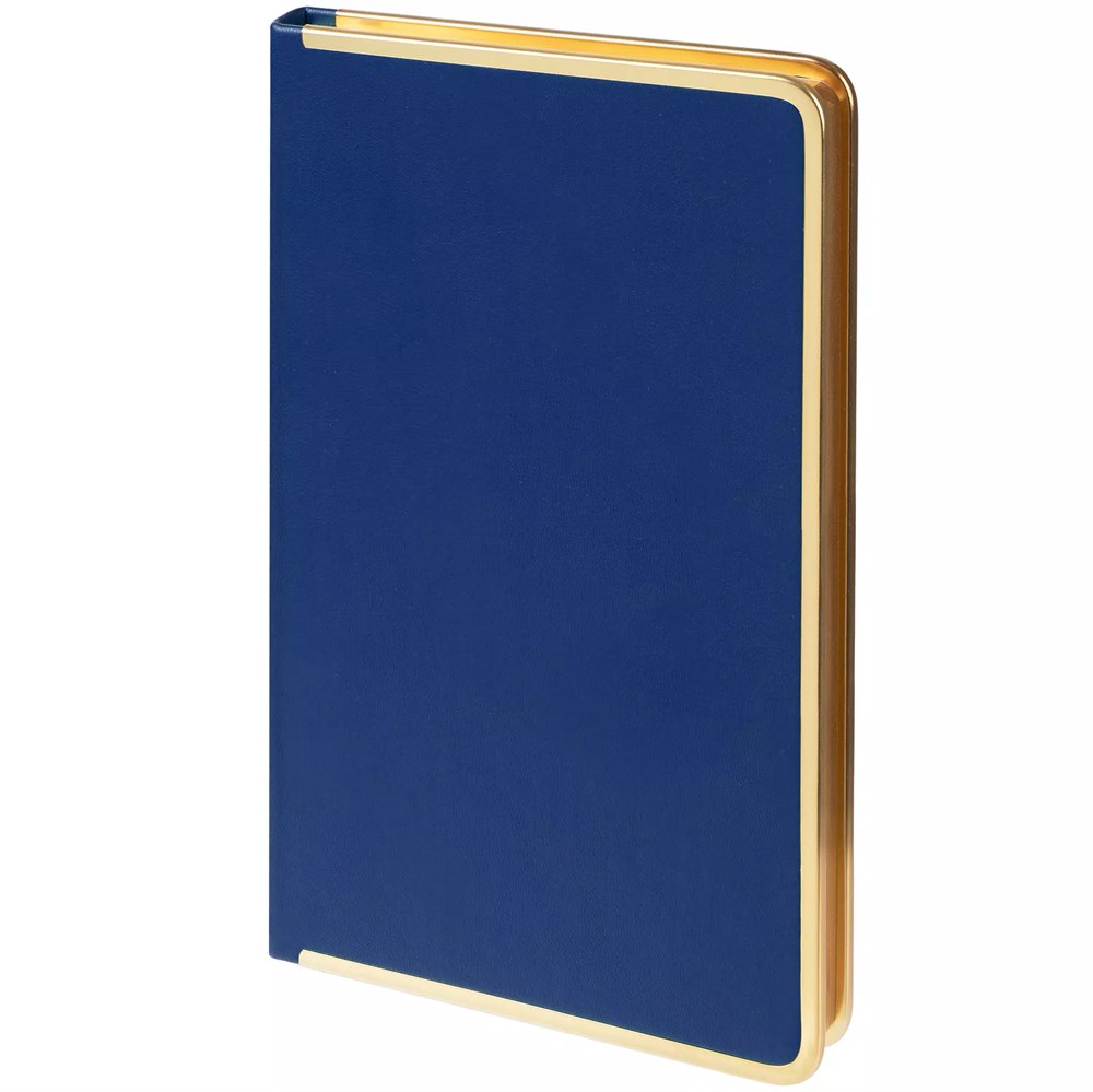 Изящный ежедневник с зауженным блоком и стильными деталями — металлической окантовкой на обложке и металлизированным обрезом.