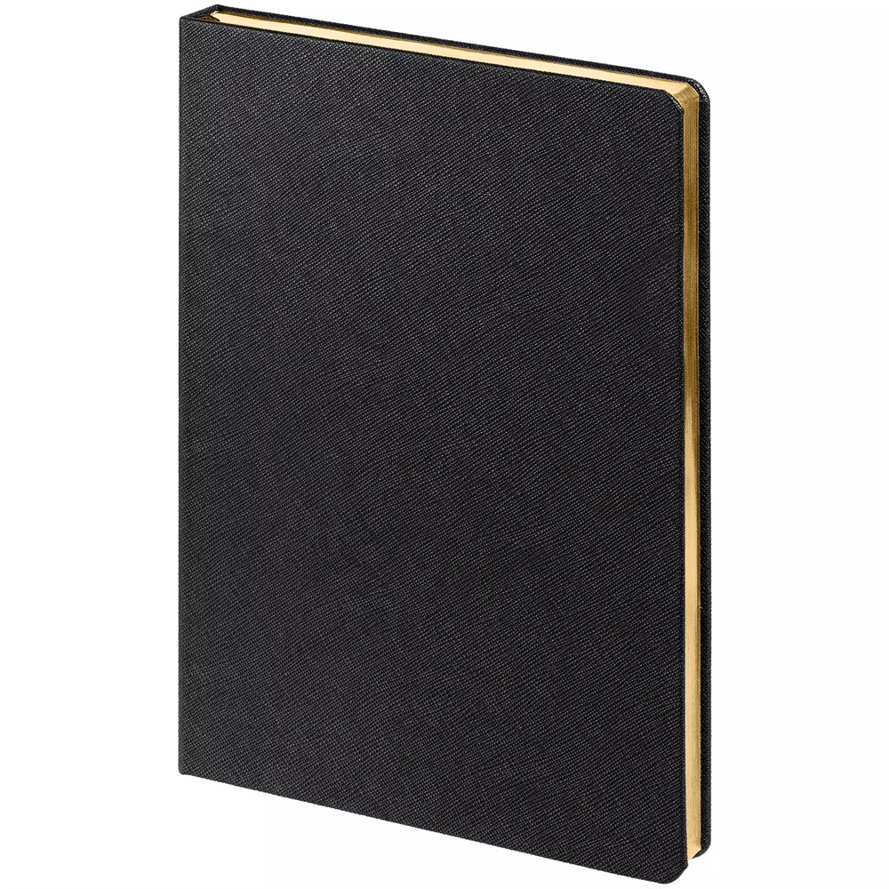Ежедневник с твердой обложкой и золотистым обрезом, выполнен из материала Saffian, черный АА, дополнен ляссе в цвет обложки.