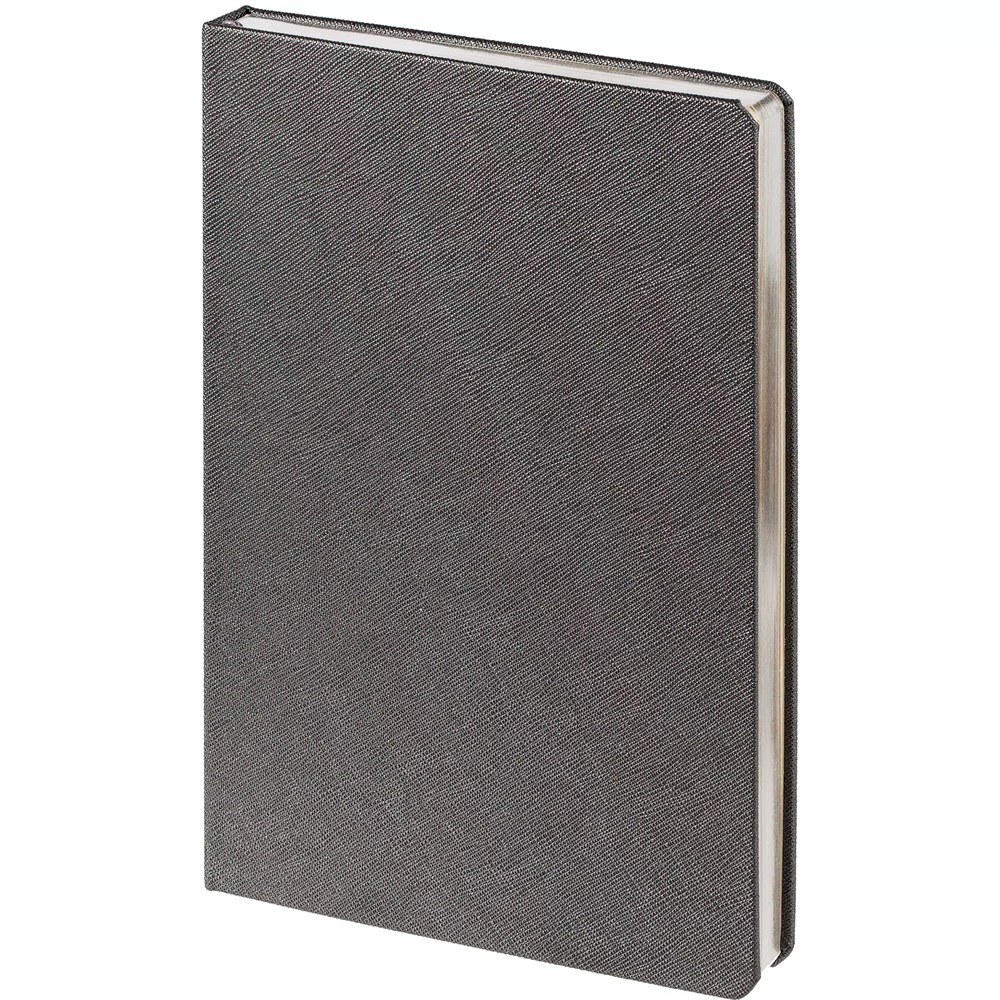 Ежедневник с твердой обложкой и серебристым обрезом, выполнен из материала Saffian, темно-серый, дополнен ляссе в цвет обложки.