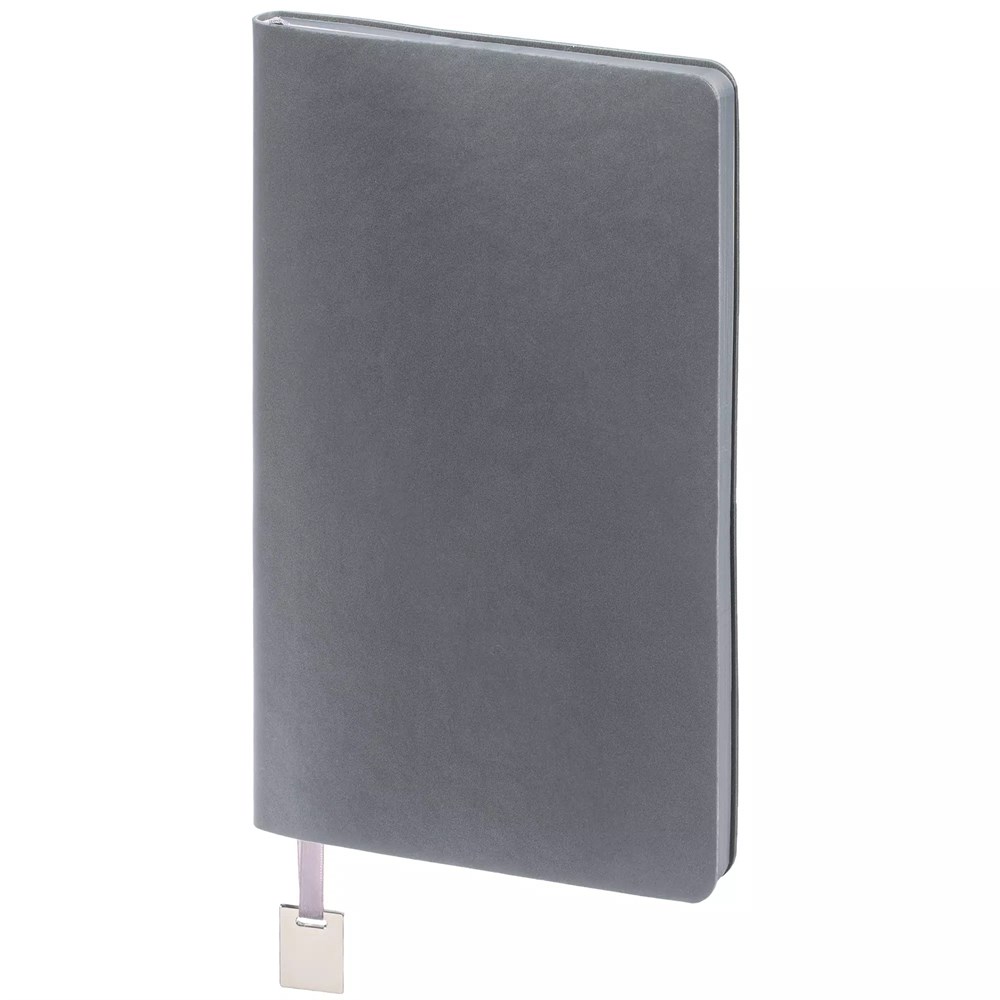 Ежедневник с гибкой обложкой, выполнен из материалов Soft Touch Pearl, серый СС, и Latte, серый (внутренняя часть обложки), дополнен ляссе в цвет обложки с металлическим шильдиком.