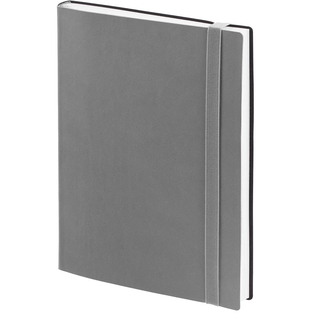 Ежедневник с гибкой обложкой выполнен из материала Latte, серый СС, и дополнен резинкой шириной 1 см, капталом и ляссе серого цвета.