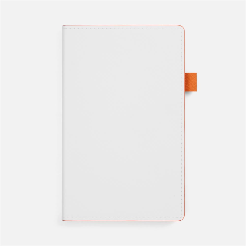 Гибкая обложка, материал обложки — Soft Touch, белый BB и Latte, оранжевый ОО; материал петли для ручки — Nice Touch, оранжевый ОО. Срез обложки окрашен в оранжевый цвет.