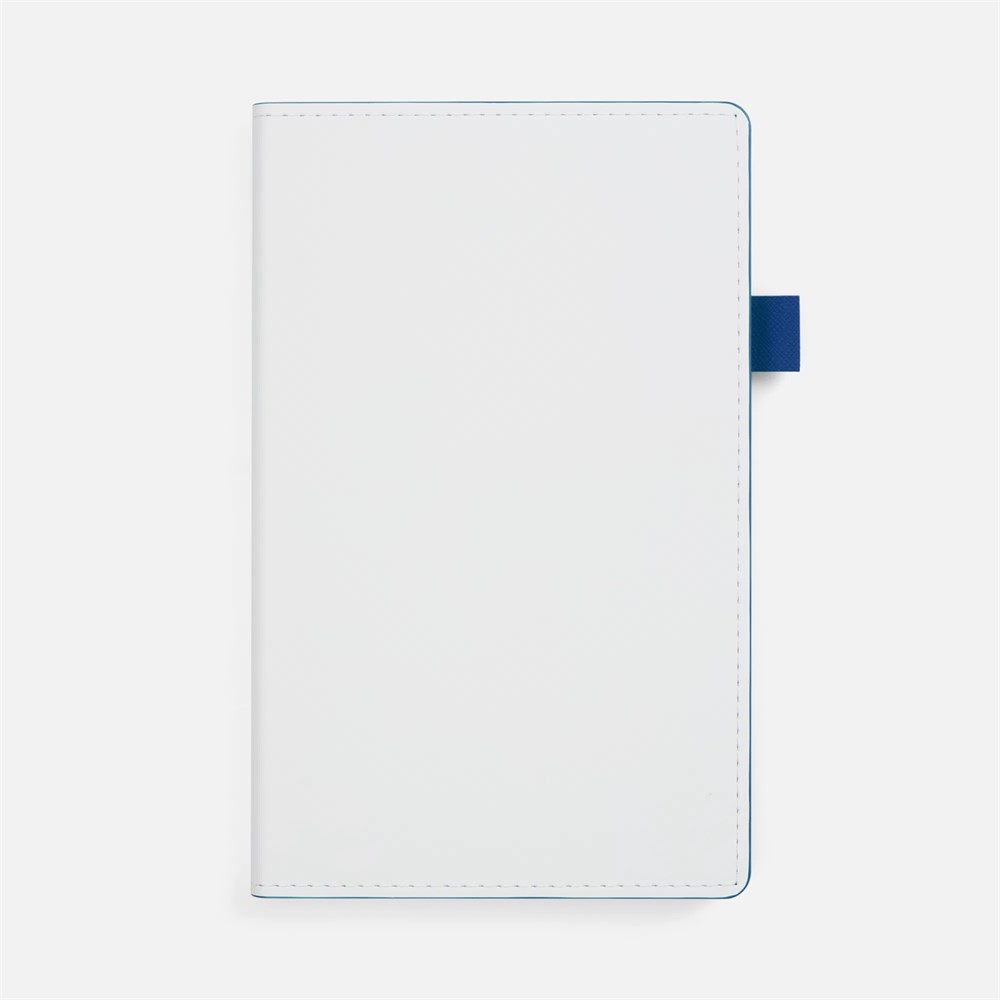 Гибкая обложка, материал обложки — Soft Touch, белый BB и Latte, синий НН; материал петли для ручки — Nice Touch, синий НН. Срез обложки окрашен в синий цвет.
