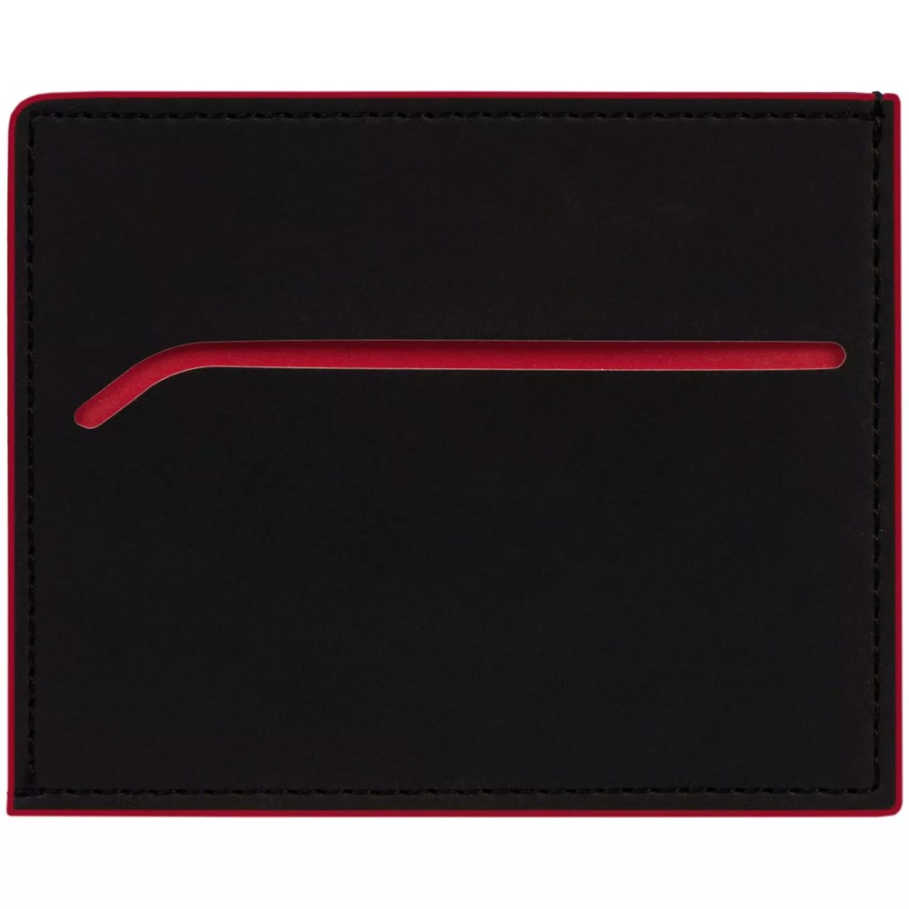 Чехол выполнен из материала Soft Touch Pearl, черный АА, дополнен окрашенным срезом края и внутренним карманом из цветного картона. Имеет 4 отделения для кредитных карт и 1 отделение для купюр.