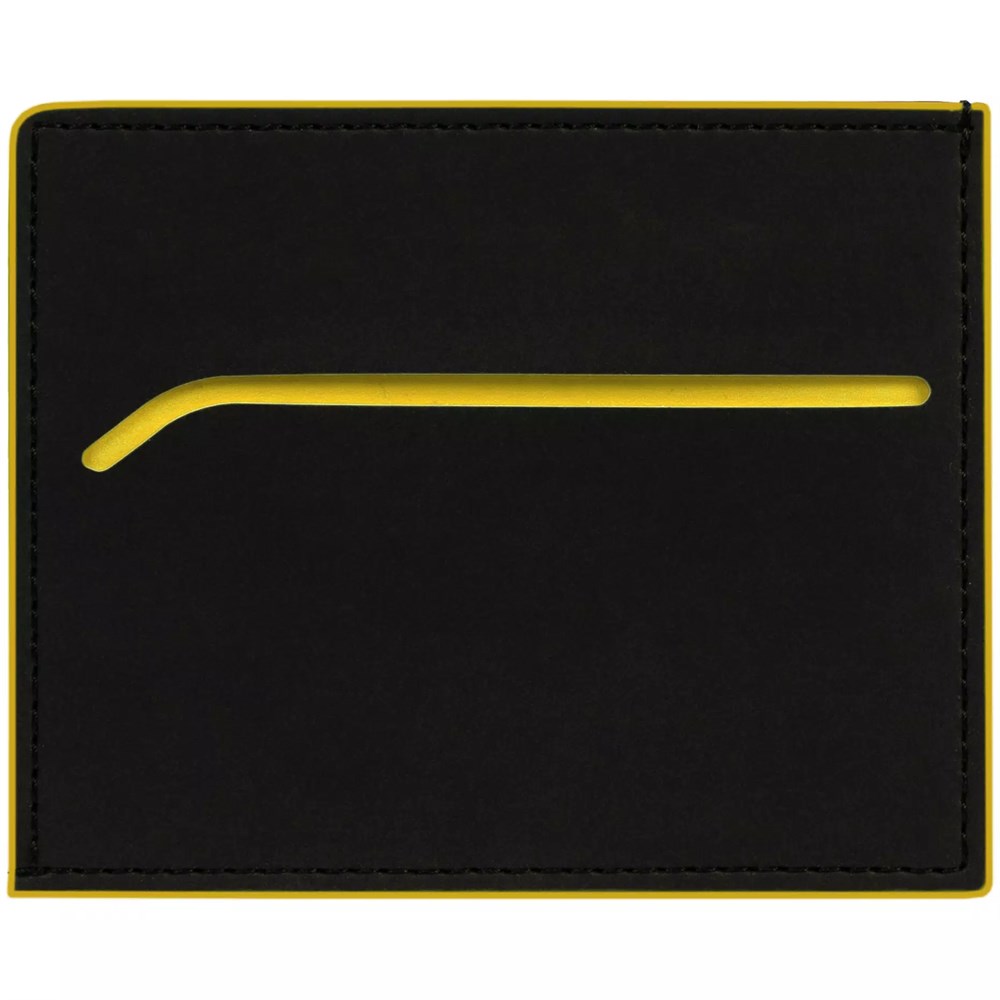 Чехол выполнен из материала Soft Touch Pearl, черный АА, дополнен окрашенным срезом края и внутренним карманом из цветного картона. Имеет 4 отделения для кредитных карт и 1 отделение для купюр.