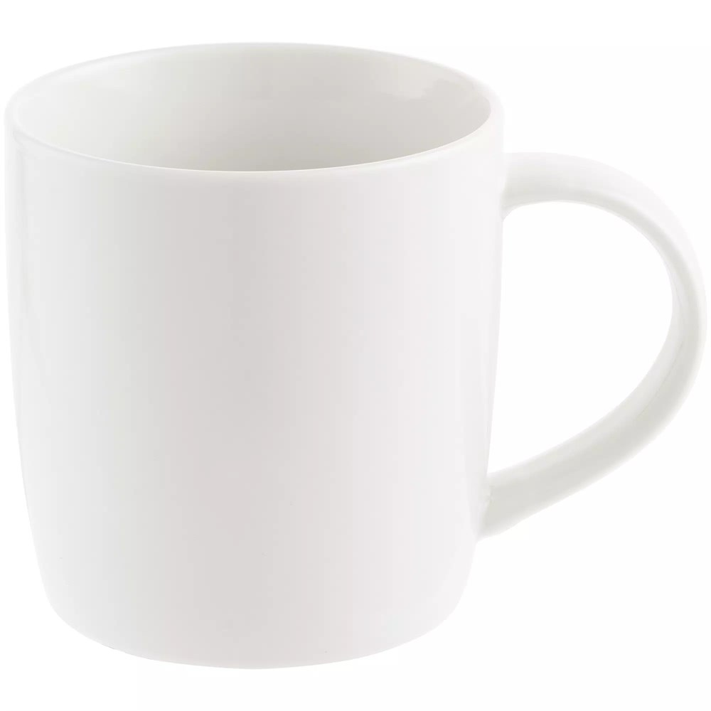 Кружка с тонкими округлыми стенками и широкой ручкой.