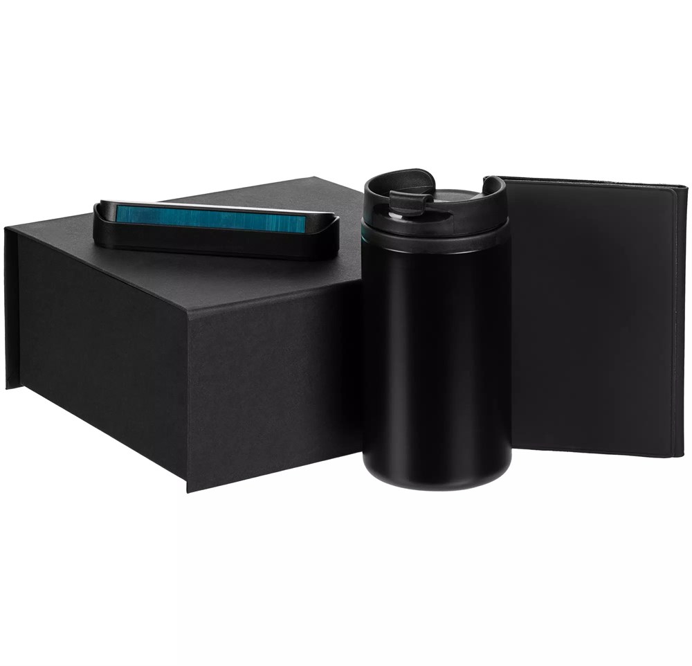 - Материалкоробка - переплетный картон; термостакан - пластик, нержавеющая сталь; визитка - пластик; обложка для автодокументов - искусственная кожа