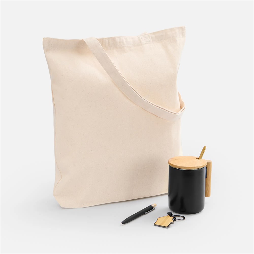 - Материалкружка - керамика, крышка, ручка - бамбук; ложка - нержавеющая сталь; сумка - хлопок 100%, плотность 210 г/м?; саржа; брелок - бамбук, металл; ручка - металл, алюминий; кнопка - бамбук