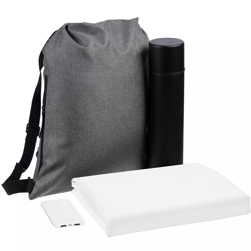 - Материалтермос - нержавеющая сталь, пластик; аккумулятор - пластик, покрытие софт-тач; дождевик - полиэстер 100%, плотность 60 г/м?; таффета; рюкзак - полиэстер, 300D