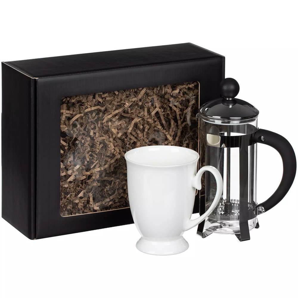 - Размерыфренч-пресс: высота 19 см, диаметр 7 см, ширина с ручкой 11,5 см; кружка: диаметр сверху 8,5 см; высота 10,8 см; дно 6 см; коробка: 25,9х19,7х9 см