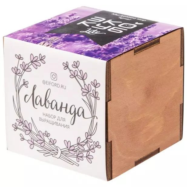 В наборе: деревянный куб, бумажный стаканчик, питательный грунт, семена, вермикулит.