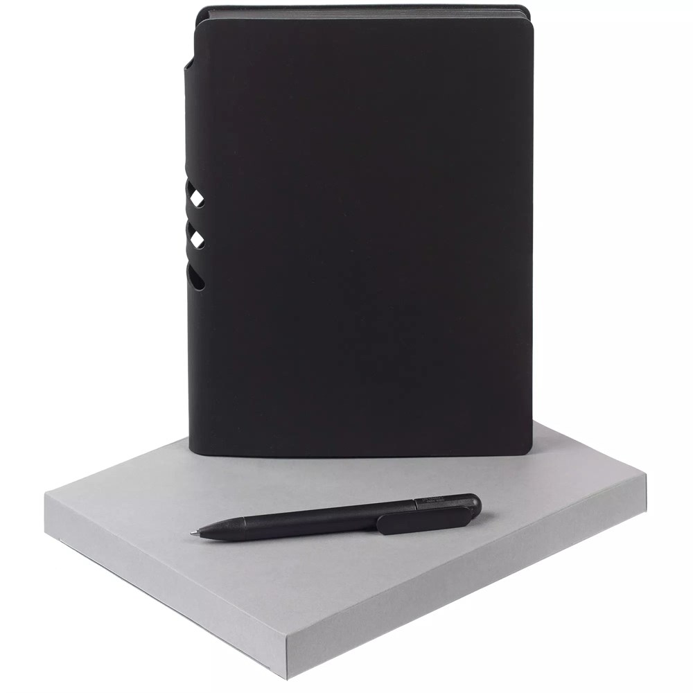 Удобный ежедневник с гибкой обложкой и местом под ручку в корешке, миниатюрная ручка из переработанного пластика и компактная самосборная коробка — простые составляющие полезного делового набора.