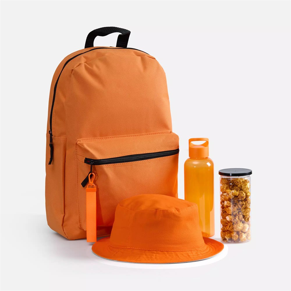 В нем есть все необходимое для комфортной летней прогулки: всегда актуальная в солнечный день панама, стиль которой можно менять буквально на ходу; бутылка для воды оптимального объема, а также сладкий снек для полезного и питательного перекуса. А захватить все с собой, конечно, будет удобно в лаконичном базовом городском рюкзаке, дополнительно оформленном ремувкой — стильным съемным текстильным брелком.