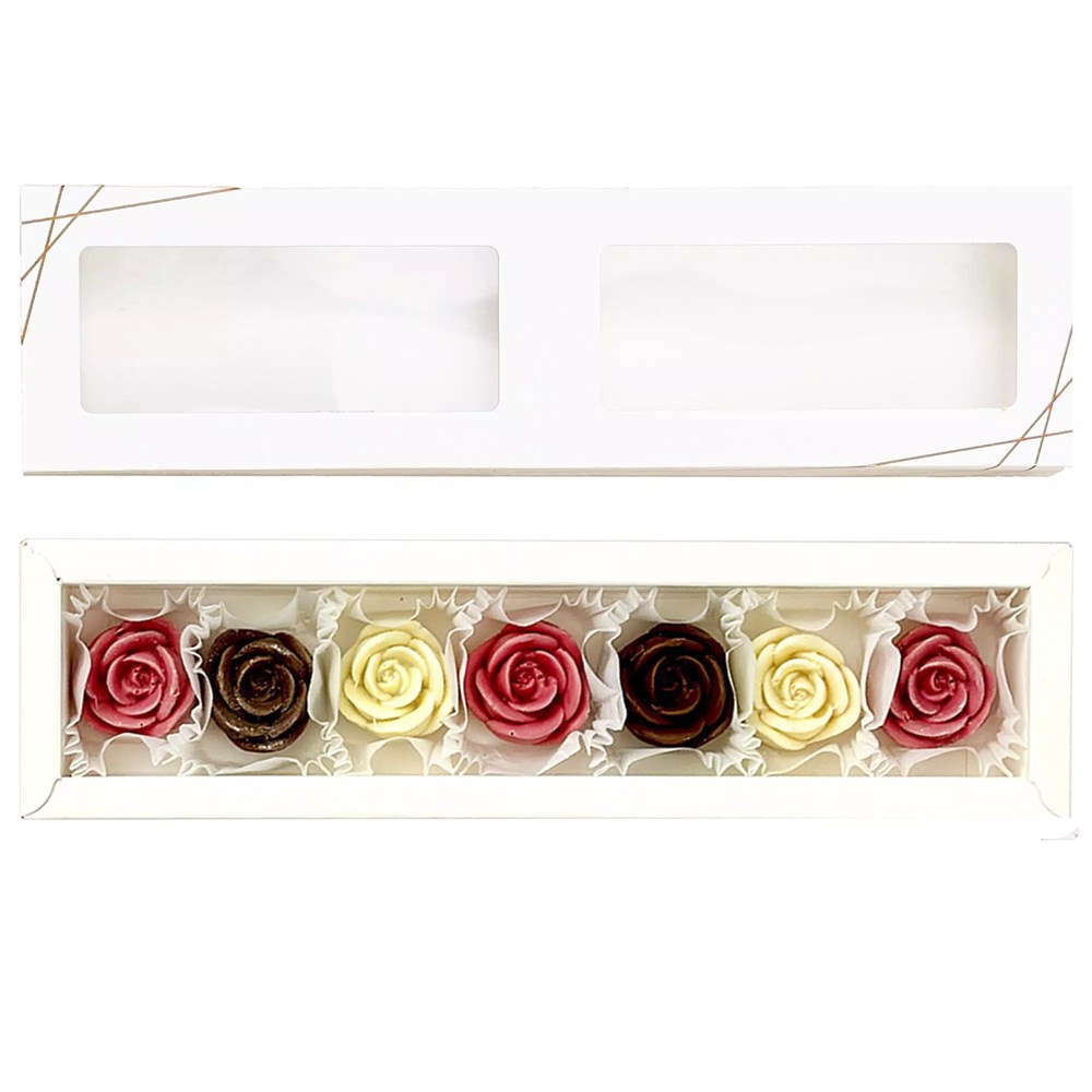 Насладитесь тонким вкусом молочного, нежным ароматом белого и ярким вкусом клубничного шоколада, заключенных в форму изысканных роз.