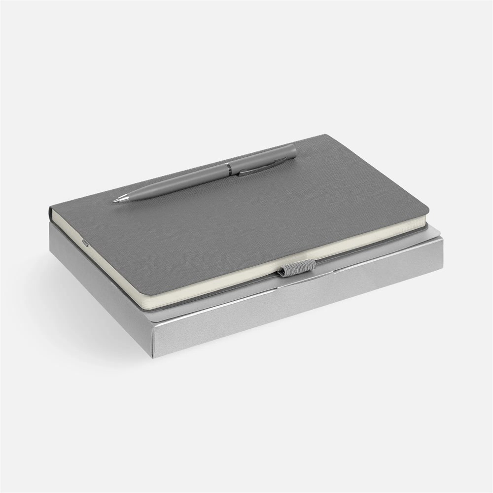 Зауженный ежедневник и ручка комплементарного оттенка в простой лаконичной коробке — готовое предложение делового подарка для сотрудников и партнеров.