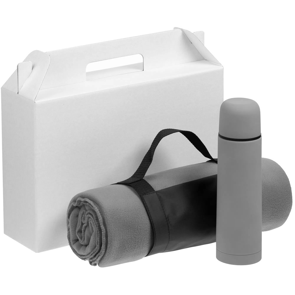 - Материалплед - флис, плотность 180 г/м?; термос - нержавеющая сталь, 304 внутри, 201 снаружи, пластик, покрытие софт-тач; коробка - микрогофрокартон