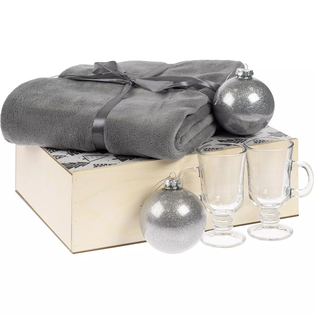 - Материалкружка, елочный шар - стекло; плед - полиэстер 100%; коробка - дерево, фанера