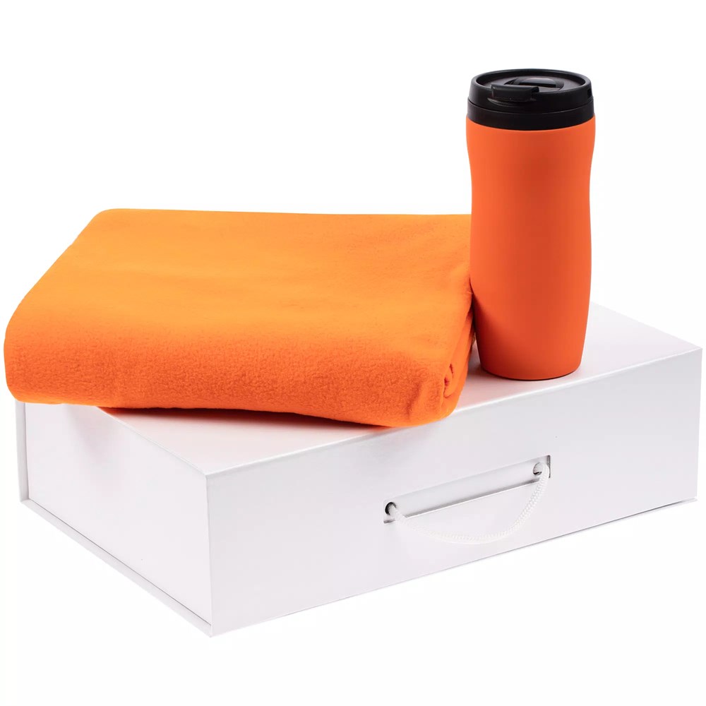 - Материалтермостакан - пластик, крышка, внутренняя колба; нержавеющая сталь, корпус; покрытие софт-тач; плед - флис, плотность 180 г/м?; коробка - переплетный картон; наполнитель - бумага