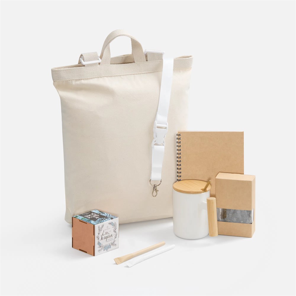 - Материалрюкзак - хлопок, плотность 280 г/м?; кружка - керамика, ручка - бамбук; ложка - нержавеющая сталь; Набор для выращивания - дерево; блокнот, ручка - картон; коробка - микрогофрокартон, Т-23Е; лента - нейлон, пластик; металл