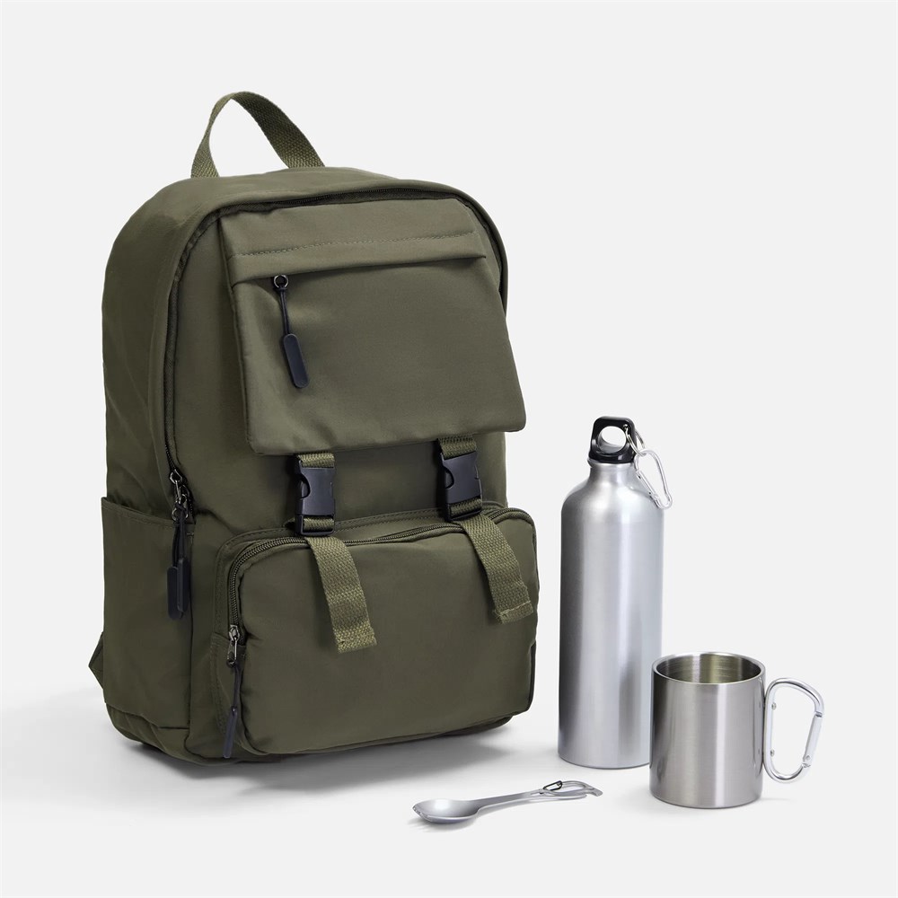 - Материалрюкзак - нейлон; кружка - пищевая сталь, 304, внутри - нержавеющая сталь, 201; бутылка - алюминий; столовый прибор - нержавеющая сталь, 420