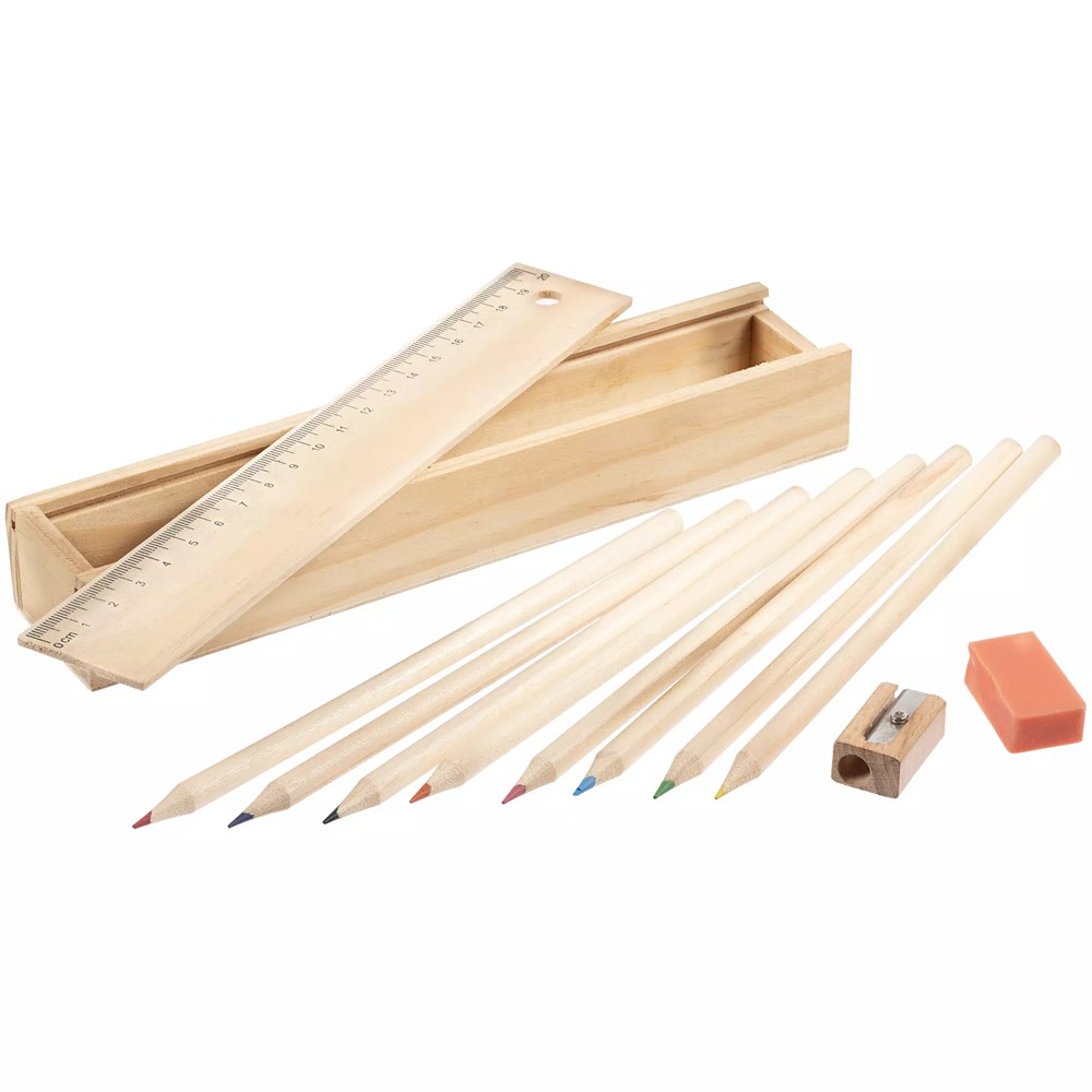 Набор из восьми цветных карандашей, точилки и ластика в деревянном пенале с крышкой-линейкой.