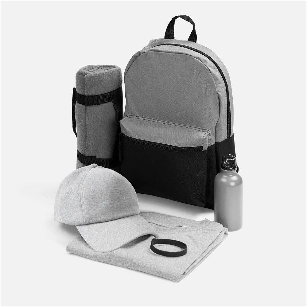 - Материалплед - флис, плотность 180 г/м?; рюкзак - полиэстер, 600D, оксфорд; бейсболка - полиэстер, 75%; хлопок, 25%, плотность 170 г/м?; джерси; футболка - хлопок 100%, плотность 140 г/м?; джерси; бутылка - алюминий; браслет - силикон