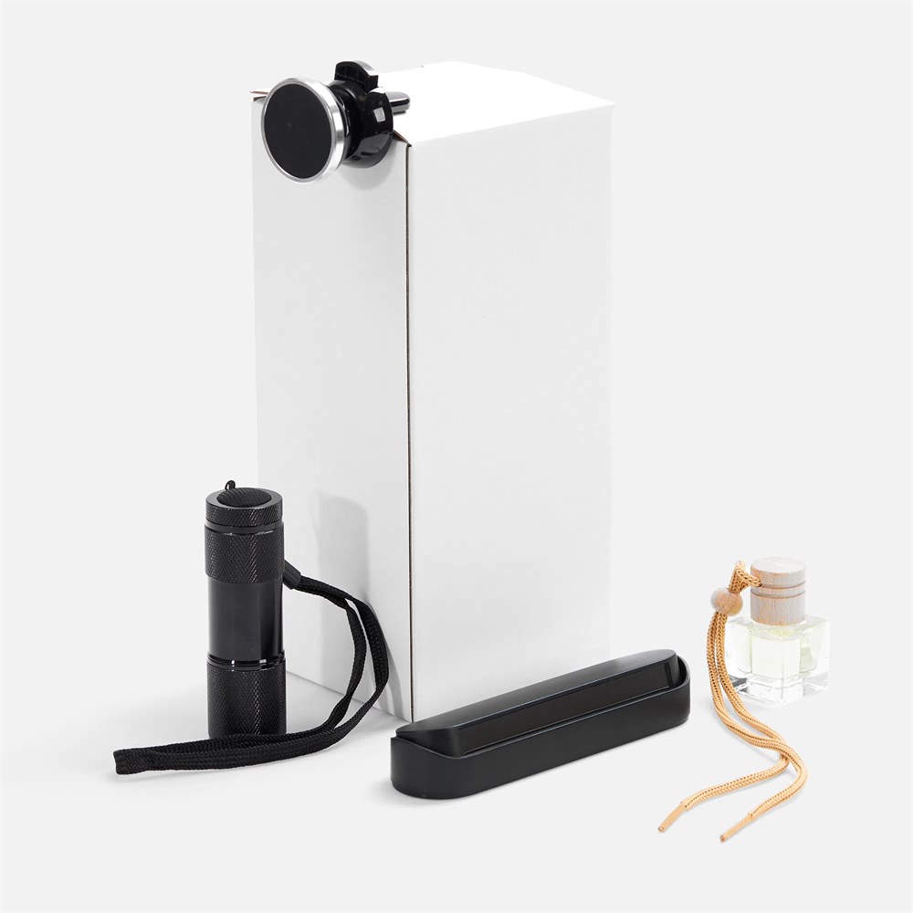 - Материалдержатель - АБС-пластик; визитка - пластик; фонарик - алюминий; ароматизатор - стекло, дерево; коробка - микрогофрокартон