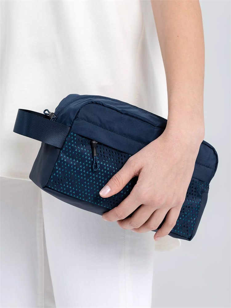 Цвет Outer Space лег в основу коллекции сумок Triangel, позволяя создать модное монохромное сочетание с изделиями Manevr темно-синего цвета. Изделия изготовлены из шелковистого полиэстера, в отделке использована лазерная перфорация паттерна.