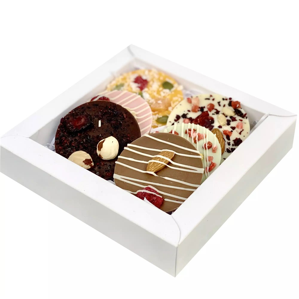 В наборе 6 медиантов с разными вкусами: медиант из молочного шоколада с сублимированной малиной и миндалем; медиант из лаймового шоколада с фисташкой и сублимированной клубникой; медиант из темного шоколада с фундуком, клюквой и черной смородиной; медиант из белого шоколада с клюквой; медиант из апельсинового шоколада с тыквенной семечкой и цукатами; медиант из клубничного шоколада с клубникой и миндалем.