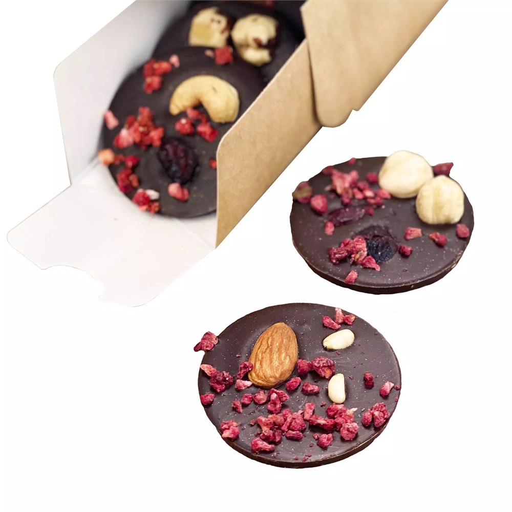 В наборе 12 медиантов из темного шоколада с посыпкой из сублимированных ягод и орехов.