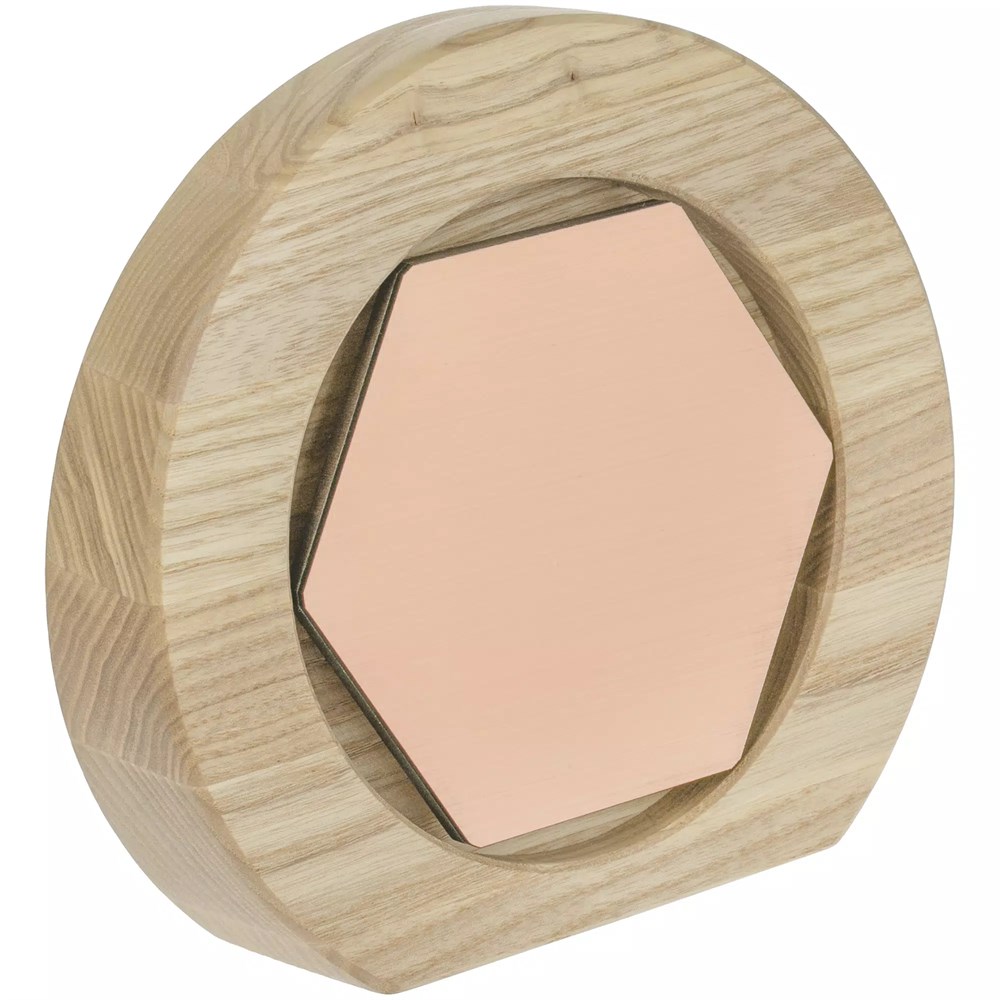Вставка с шестигранником из зеркального пластика на деревянной основе крепится на приподнятое основание внутри стелы, что создает объем и многослойность награды. На вставке предусмотрен клеевой слой для крепления после нанесения.