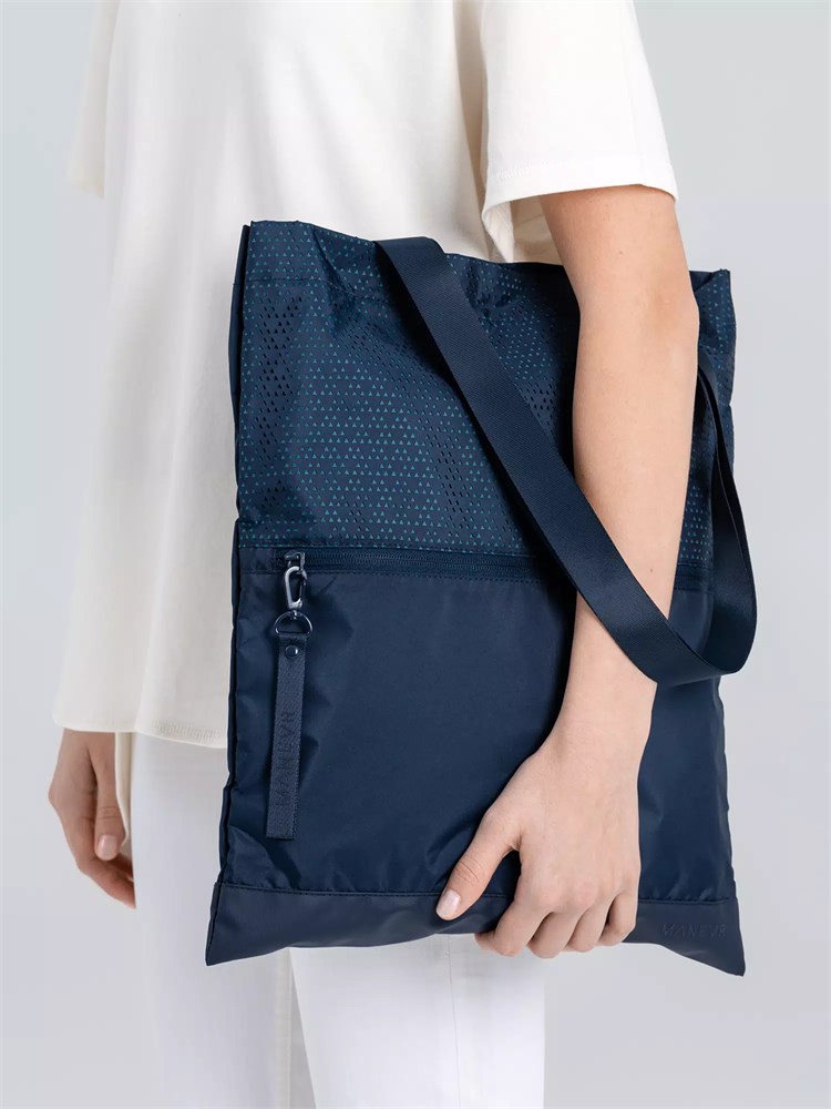Цвет Outer Space лег в основу коллекции сумок Triangel, позволяя создать модное монохромное сочетание с изделиями Manevr темно-синего цвета. Изделия изготовлены из шелковистого полиэстера, в отделке использована лазерная перфорация паттерна.