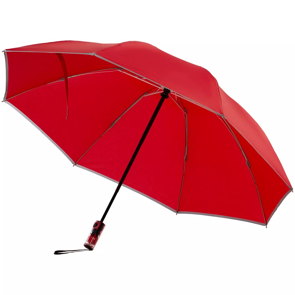 Складной зонт Futurum привлекает внимание оригинальным дизайном. Складываясь после дождя, он прячет мокрую поверхность в себя, а сухая остается снаружи. Светоотражающий кант и ручка из прозрачного пластика, не скрывающая ярких деталей внутри, добавляют внешнему виду зонта футуристичности.