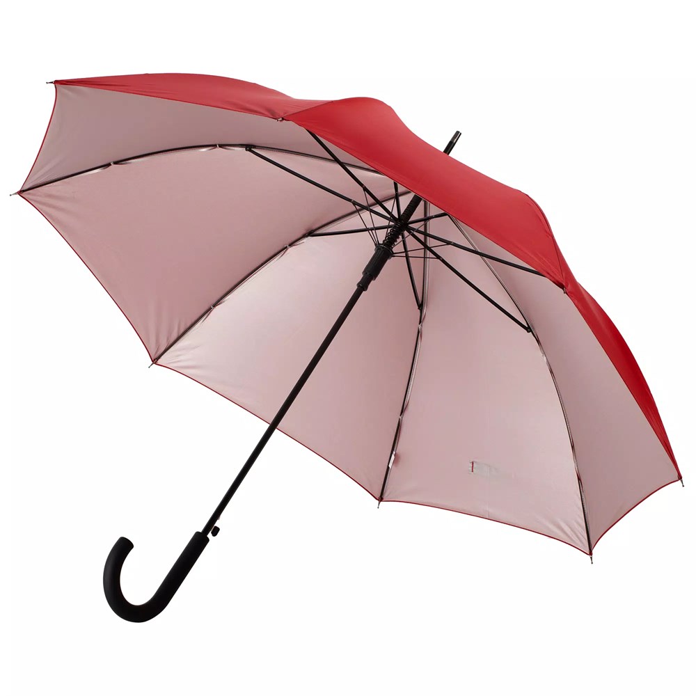 Легкий зонт-трость классической формы, который выглядит нескучно благодаря современным деталям исполнения — серебристому покрытию на внутренней части купола и мягкой прорезиненной ручке.